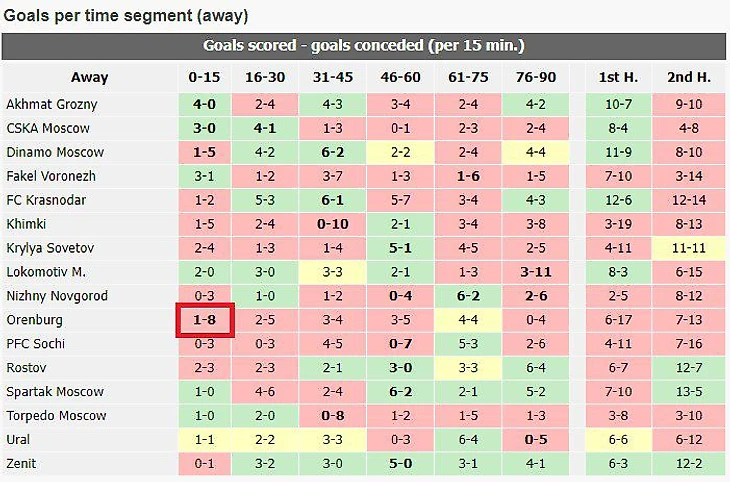 2) Кто мог бы жаловаться на привыкание к естественному газону на выезде - так это "Оренбург". Разница мячей в первые 15 минут выездных матчей просто катастрофическая - 1:8.