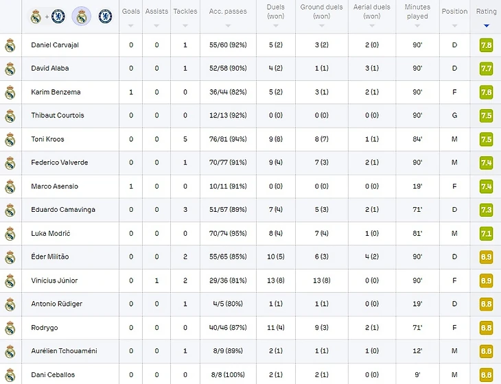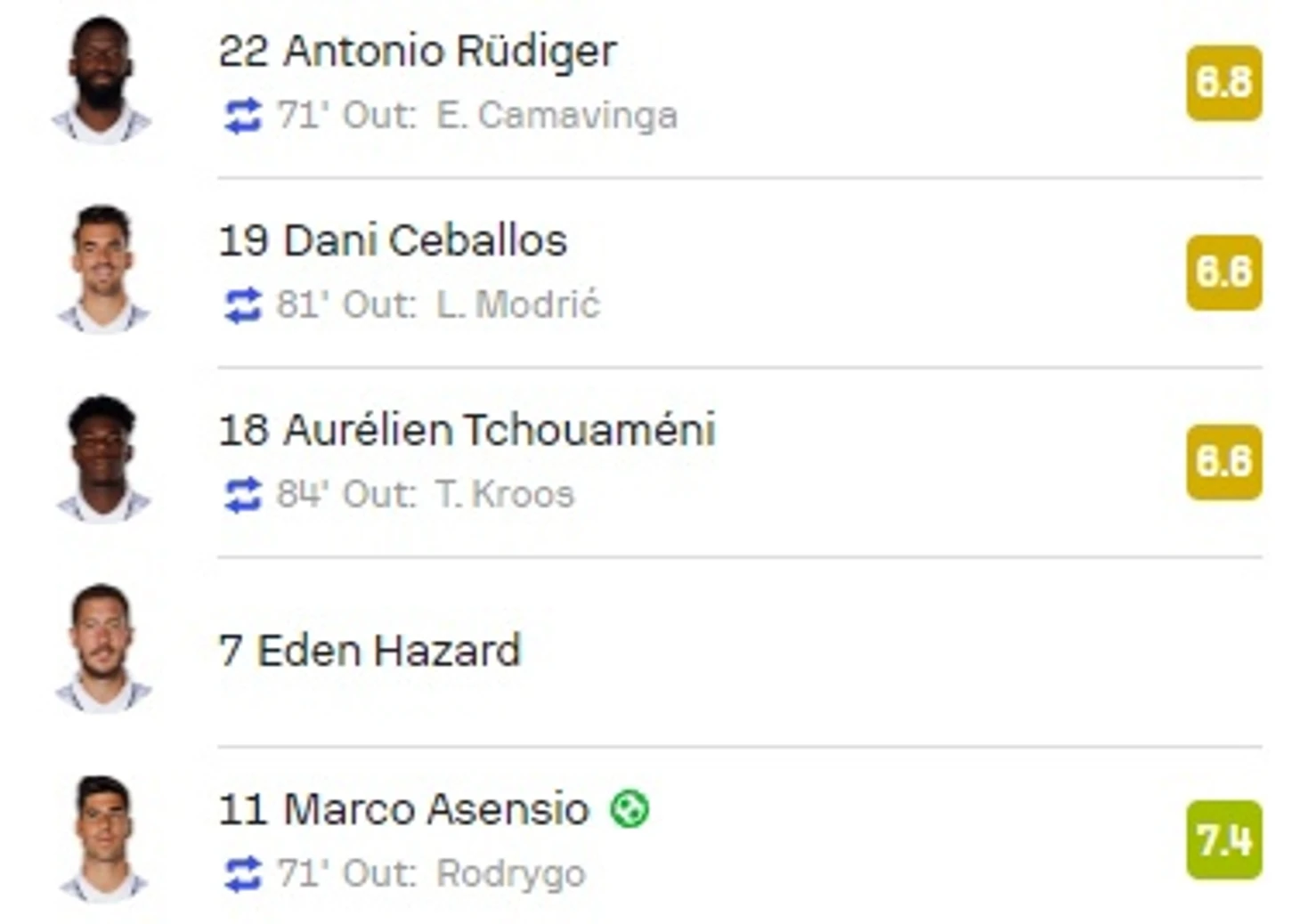 Все игроки «Реала» выступили достойно и уверенно, и портал SofaScore оценил большинство из них достаточно высоко. Самый большой балл получил Дани Карвахаль, который действительно был одним из самых полезных игроков на поле, не только отрабатывая в обороне, но и подключаясь к атакам.
