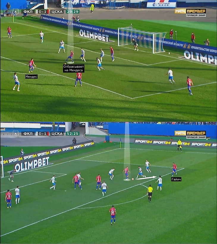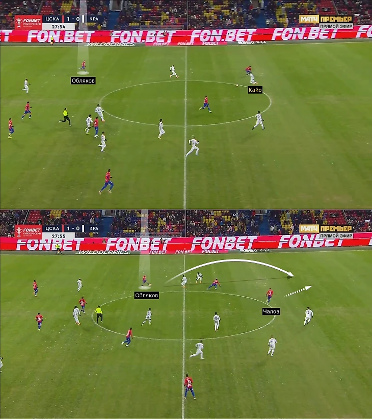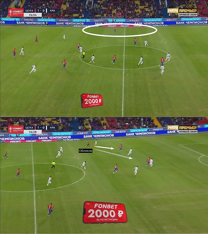 С «Крыльями» (4:0) работа в контрпрессинге помогла создать сразу два гола. При атаках по флангу Гайича Обляков не занимал классическую позицию латераля, а оставался ближе к полуфлангу, реагируя на ошибки «Крыльев» на мяче. После потерь ЦСКА сразу включался в отбор, а Обляков забрал несколько важных мячей в середине.