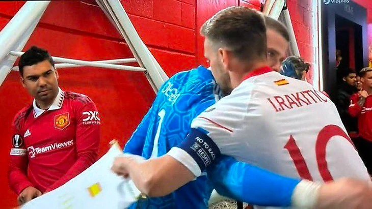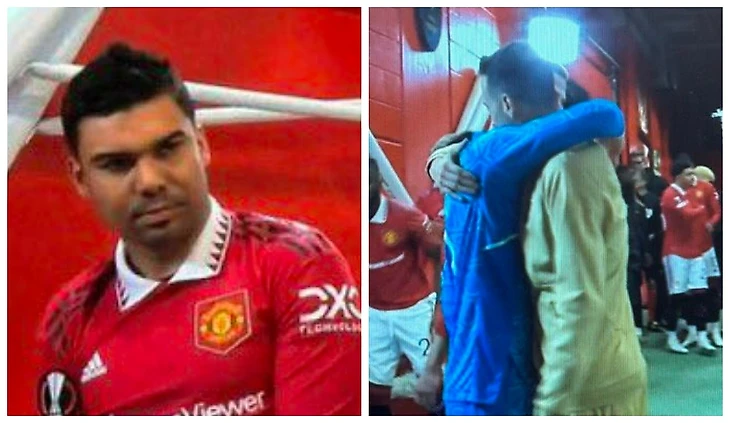 Болельщики в соцсетях обратили внимание на неодобрительное выражение лица полузащитника «МЮ», когда на его глазах в подтрибунном помещении вратарь команды Давид де Хеа обнимал игроков соперников.