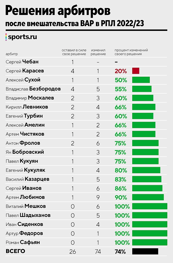 А кто чаще всего отвергает подсказки ВАР? Карасев!