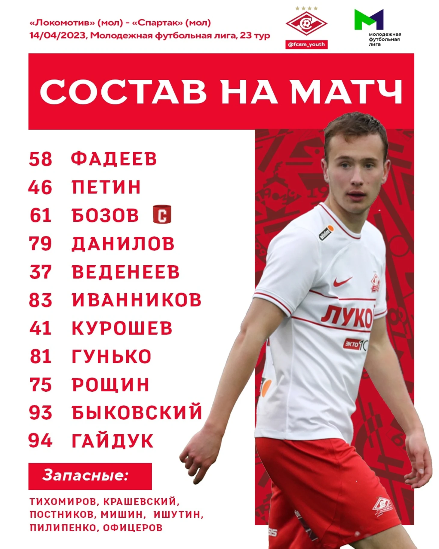 Состав. Тренерский штаб красно-белых максимально насытил центральную зону оборонительными игроками: над парой защитников Максим Веденеев — Никита Бозов расположились опорники Тимофей Данилов и Дмитрий Курошев. Отметим также первый выход в стартовом составе в молодежной лиге 18-летнего полузащитника Антона Рощина.