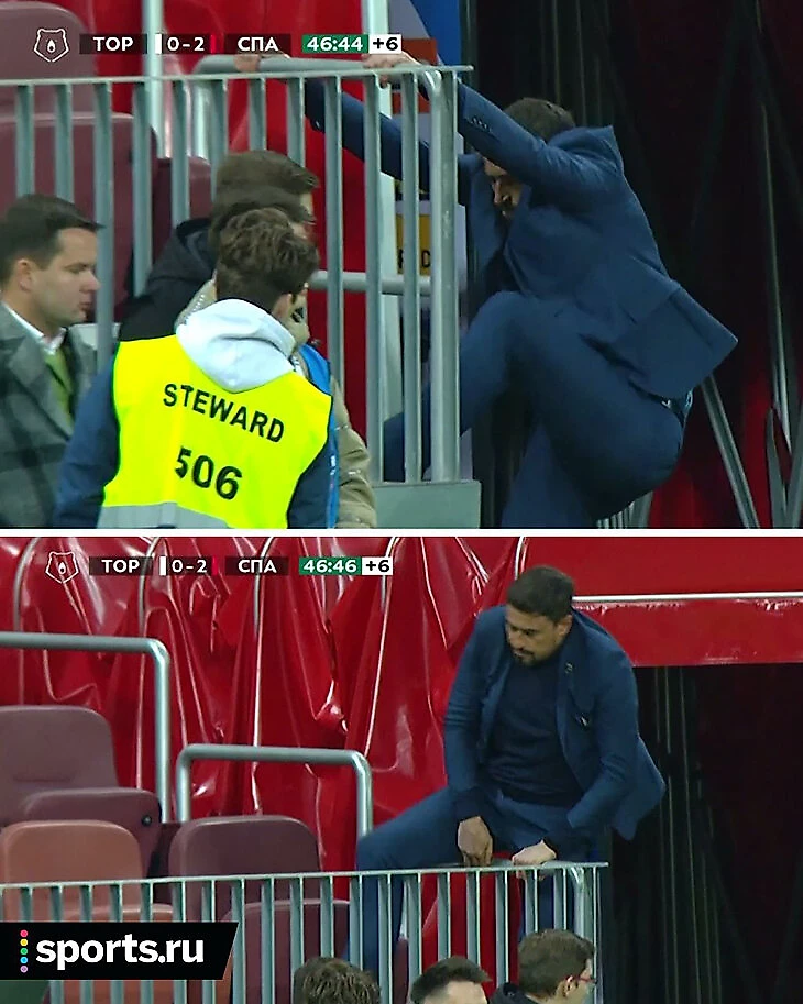 Только посмотрите, как он красиво перелез через забор, чтобы остаться на трибунах рядом со своей скамейкой.