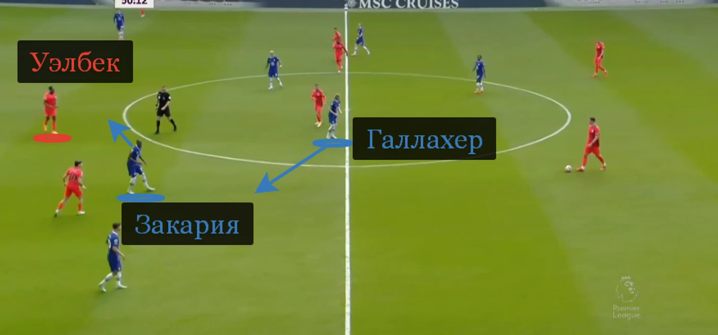 Механизм работал плохо. Доказательство – на скриншоте ниже. Галлахер задержался в полупозиции. Закария не начал отходить в опорную зону. Результат – Уэлбек получил пространство и мог принять пас из глубины.