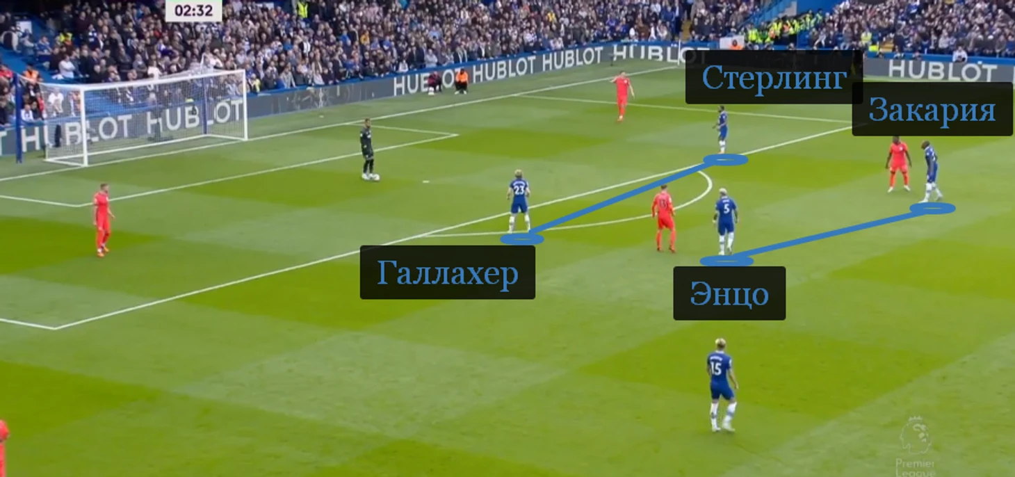 Игру против «Брайтона» лондонцы начали с активным прессингом. Фрэнк Лэмпард обратился к схеме 4-4-2. В передней линии давили Рахим Стерлинг и Конор Галлахер. Ниже, но по центру отбивались Энцо Фернандес и Денис Закария.