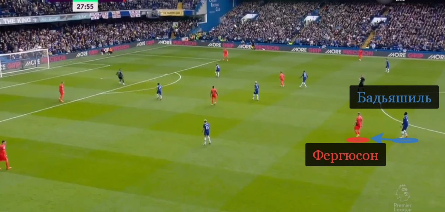 В прессинге «Челси» мог держать структуру, но подвижность Фергюсона и Уэлбека нарушала порядок сзади. Пример относится к 29-й минуте, когда Бенуа Бадьяшиль выдернулся из первой линии. Хозяевам не хватило игроков, чтобы прикрыть прострел Митомы.