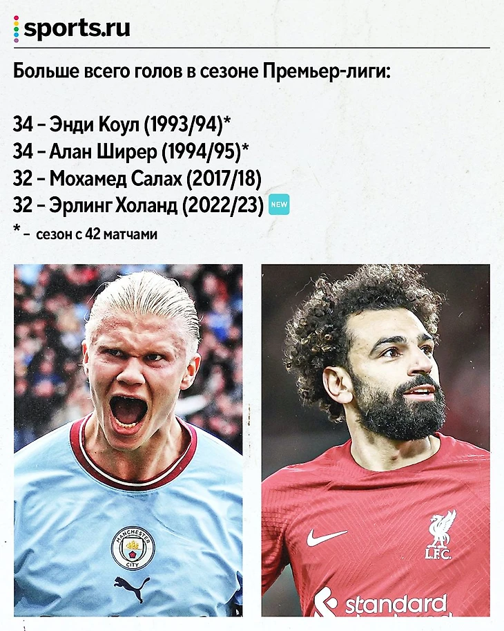 • Холанд теперь совладелец рекорда АПЛ по голам за сезон в эпоху 38 матчей: у них обоих с Мохамедом Салахом по 32 мяча, следующий гол Эрлинга станет историческим. Но уже сейчас ясно, что Эрлинг по дополнительным показателям выше египтянина, матчей-то намного меньше.