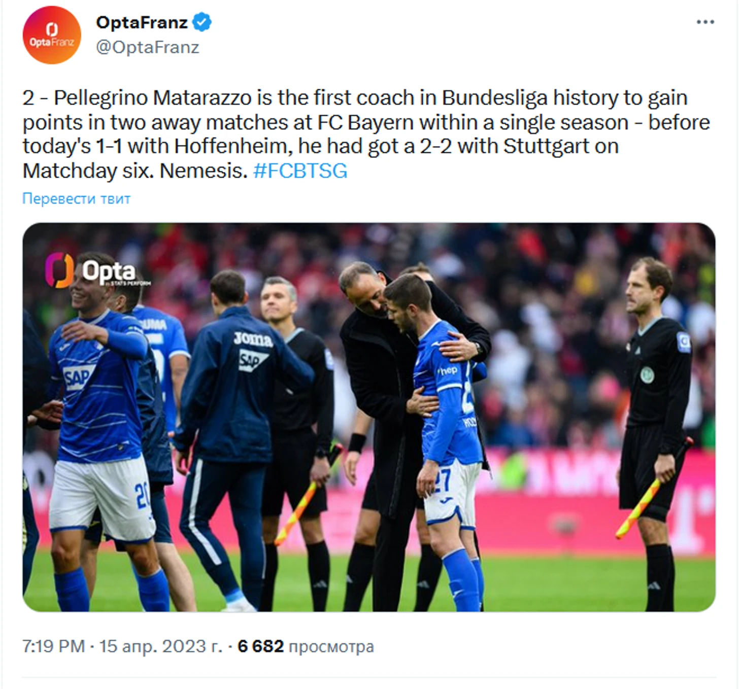 2) Пеллегрино Матараццо стал первым тренером в истории Бундеслиги, дважды за один сезон взявший очки в выездных матчах с «Баварией» (до этого - 2:2 на посту тренера «Штутгарта» в шестом туре).