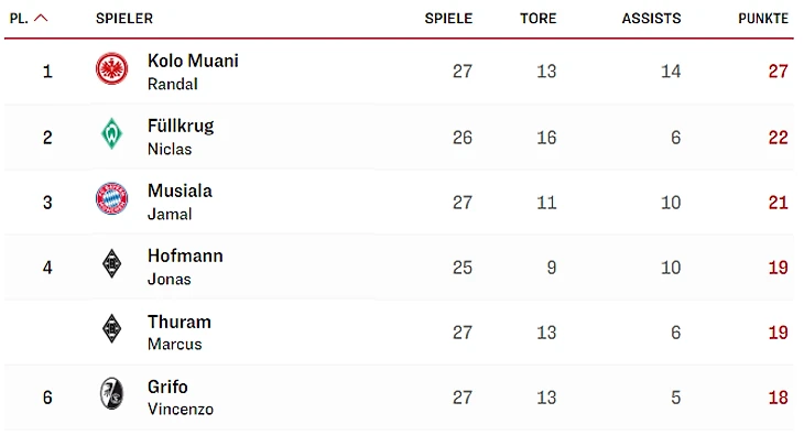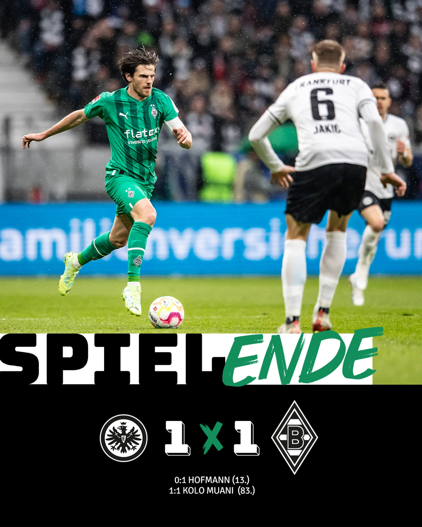 Голы: Коло-Муани 83 – Хофманн 13 Гол Коло Муани, ставший уже 13-м в сезоне обеспечил «Айнтрахту» ничью в матче с «Боруссией» М. Таким образом Рандаль теперь идёт вторым как в гонке бомбардиров, так и ассистентов Бундеслиги. Тюрам же ответил результативной передачей в дебюте встречи.