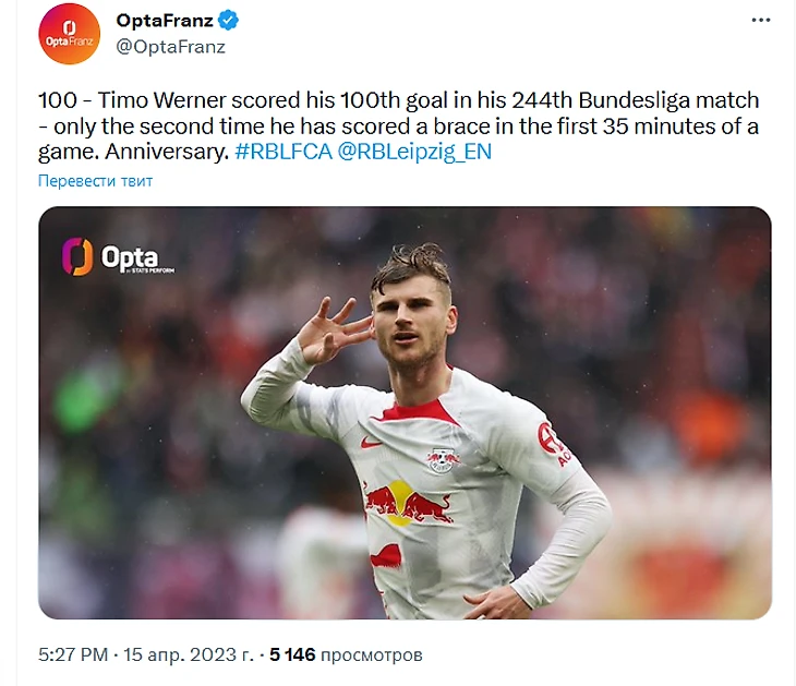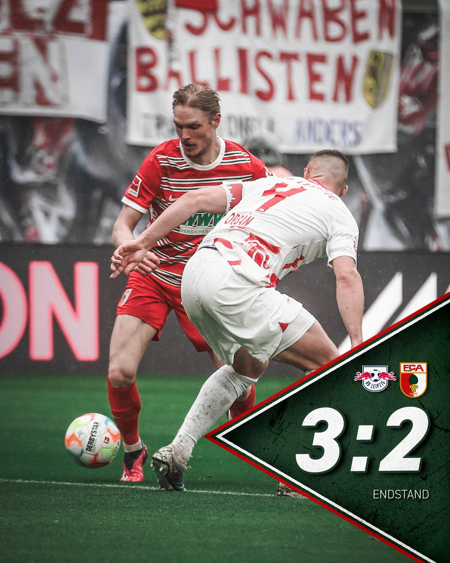 Голы: Кампль 10, Вернер 32, 35 – Майер 5, Варгас 82 У кого не было права на ошибку, так это у «РБ Лейпцига», выигравшего всего две игры из пяти последних, что ударило по их шансам на финиш в топ-4. Не предвещал добра и пропущенный гол от Арне Майера, который вывел «Аугсбург» вперёд после ошибки Хенрикса. Тут-то и проснулся ещё один прославленный герой немецкого эпоса Тимо Вернер. За полчаса экс-форвард «Челси» ассистировал Камплю и сам оформил дубль, преодолев черту в сотню голов в Бундеслиге. Особенно эпичным получился последний, сотый точный выстрел. Пожалуй, самый красивый из всех для Тимо на немецких полях, обеспечивший к тому же место в топ-4 по итогам тура. После перерыва отлично выглядел у хозяев и Нкунку, но свой гол он не забил, заметно хуже проводит Кристофер этот сезон, нежели предыдущий, виной всему, разумеется, выступила травма, из-за которой футболист и ЧМ в Катаре пропустил. Что же до матча, то на 82-й минуте «фуггеров» немного подтянул Варгас, который из-за пределов чужой штрафной пробил в правый угол ворот оппонента – 3:2.