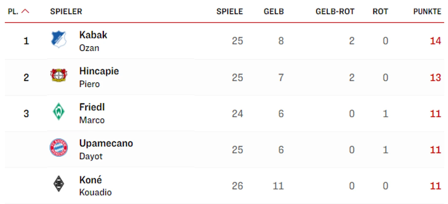 *игрок – кол-во игр – желтые – 1+1 желтые – красные – всего