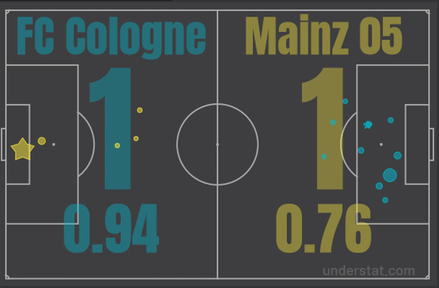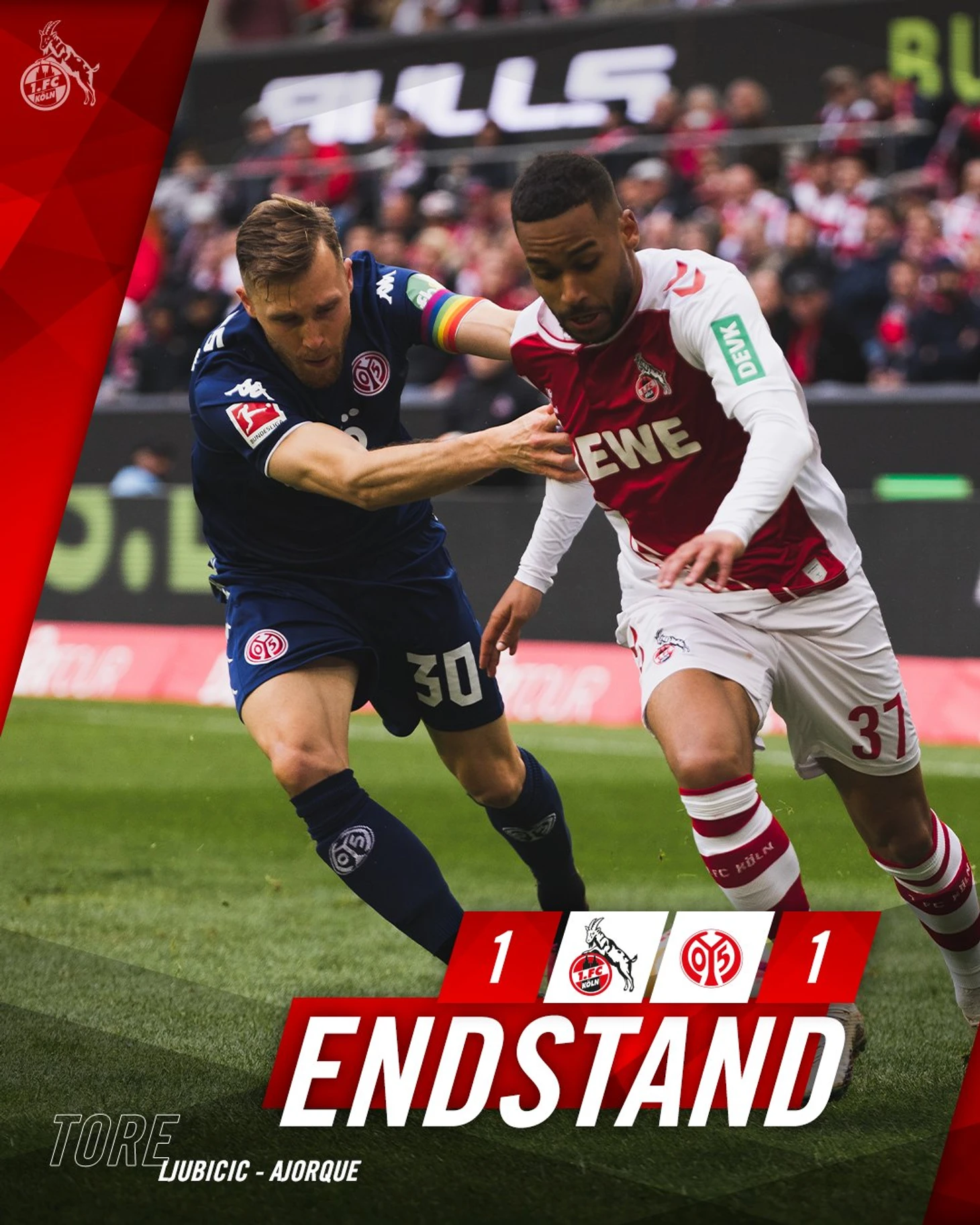 В 28-м туре чемпионата Германии «Кёльн» принимал ещё одних середняков соревнований - «Майнц». «Козлы», в отличие от «карнавальщиков», имеют очень мало шансов на попадание в еврокубки. Так или иначе в этот день команды разошлись миром, причем подопечные Свенссона не проигрывают уже в девяти встречах подряд. Гости забили первыми, классно играющий в последнее время Ажорк отличился, Видмер стал автором голевой передачи. Хозяева поля ответили на старте второй половины встречи, когда Любичич в нижний угол классно пробил, ассистентом выступал Гектор. Немного выпадали из игры у «Майнца» Сон, может потому и не наиграли на победу. Хороший матч получился, который и звезд с неба не хватал, но и не разочаровал ни капельки.