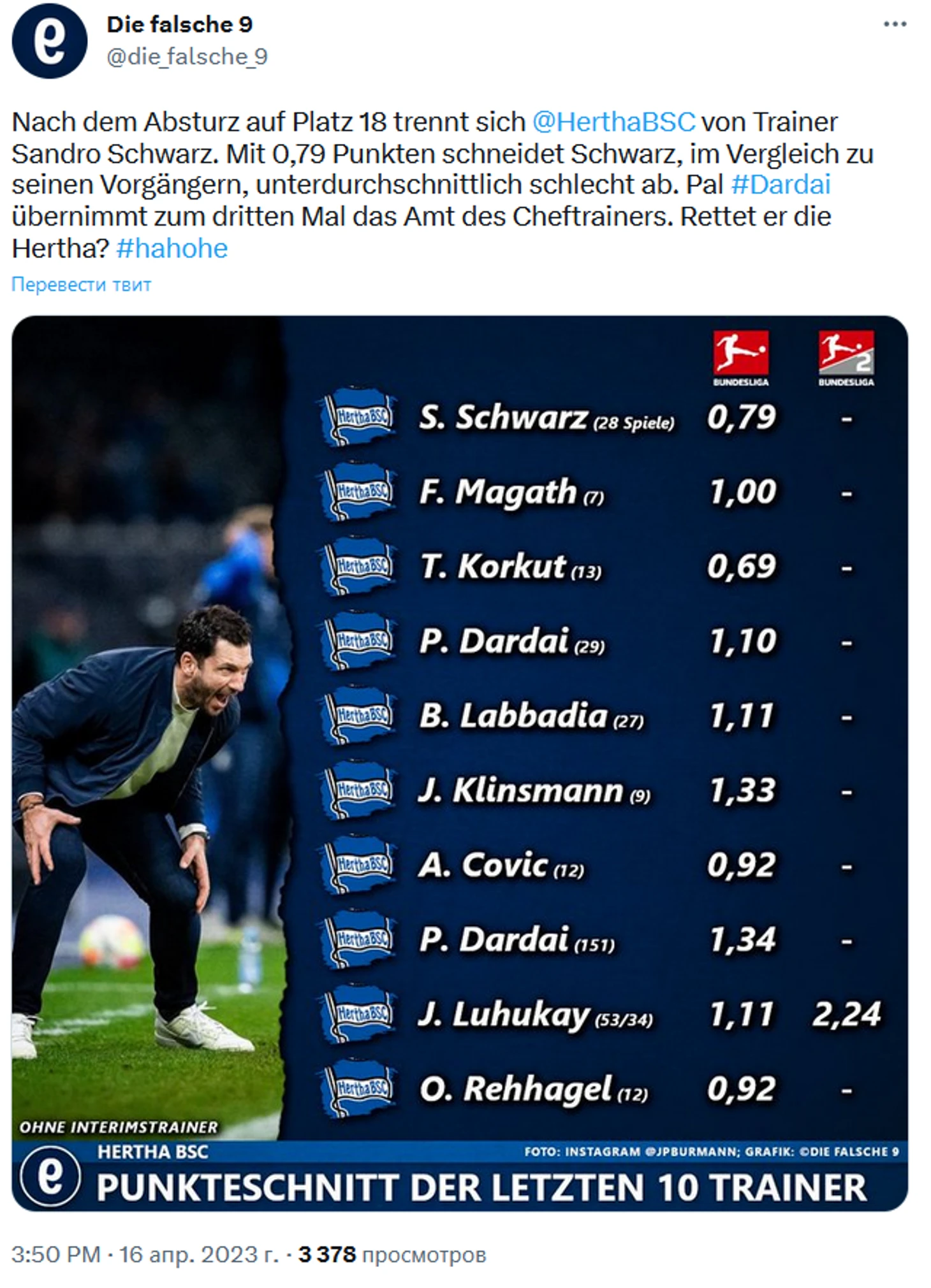 2) После 2:5 в гостях у «Шальке» Сандро Шварц из «Герты» был вынужден уйти в отставку. Это означает, что в этом сезоне восемь из восемнадцати клубов Бундеслиги сменили тренера хотя бы раз.