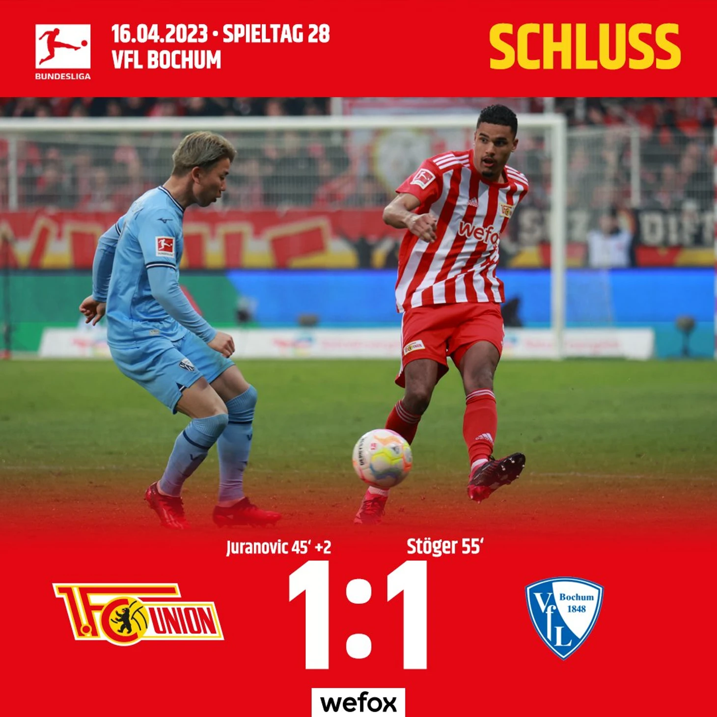 Голы: Юранович 45+2 – Штегер 55 (п) Насколько сырой была погода, настолько же сырой оказалась и игра, украшением которой стал лишь очень красивый гол Йосипа Юрановича. «Унион» и «Бохум» разделили очки сырым днём в немецкой столице. Не лучший результат для «железных» и прекрасный для «несгибаемых». Хотя и последние могут быть раздосадованы, что не конвертировали численный перевес во втором тайме в нечто большее. В борьбе за выживание два очка бы пригодились.