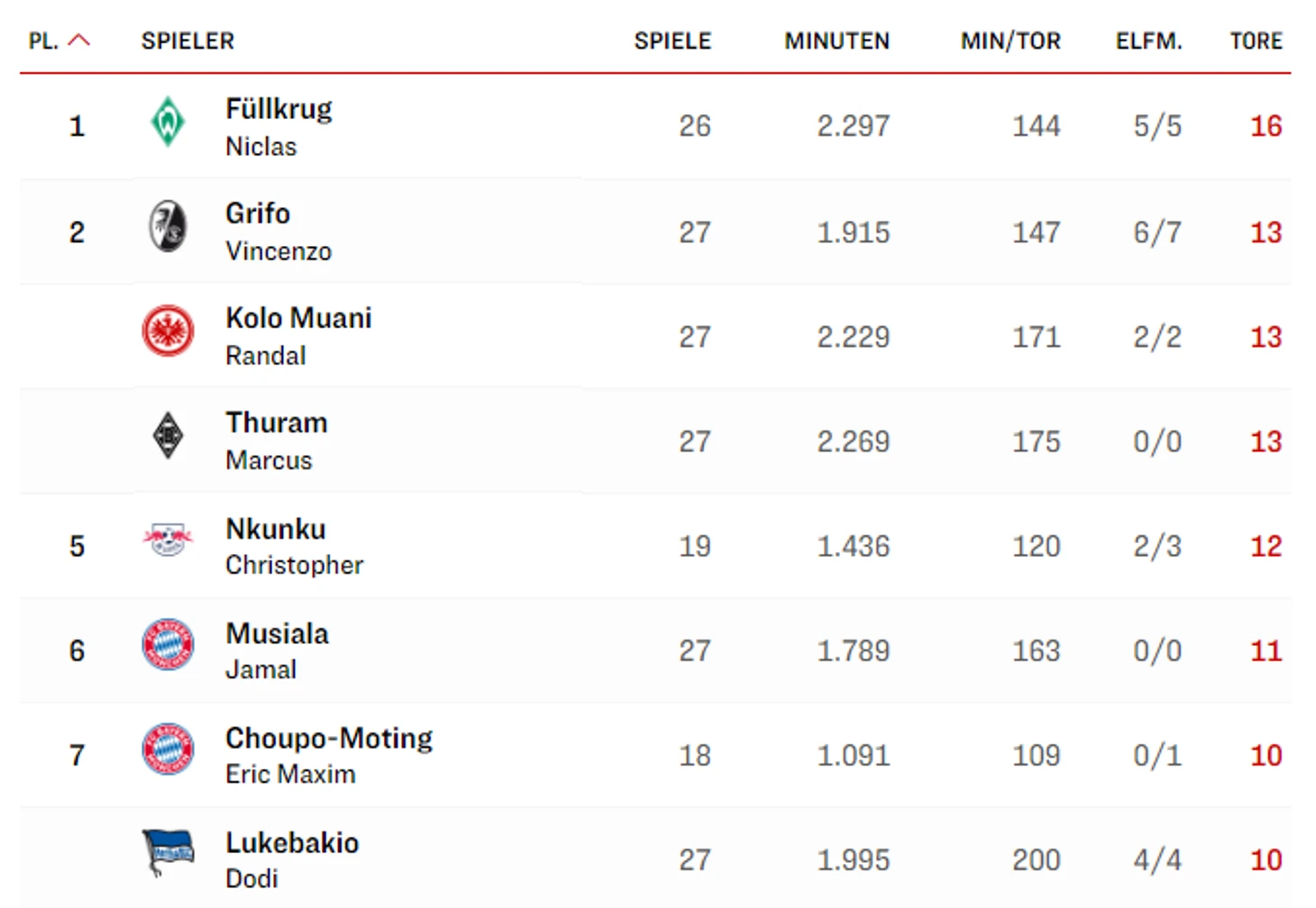 2) Рандаль Коло-Муани забил свой 13-й гол в Бундеслиге в сезоне, а в календарном 2023 году это уже его восьмой гол. Ни один другой игрок не забивал так часто после нового года.