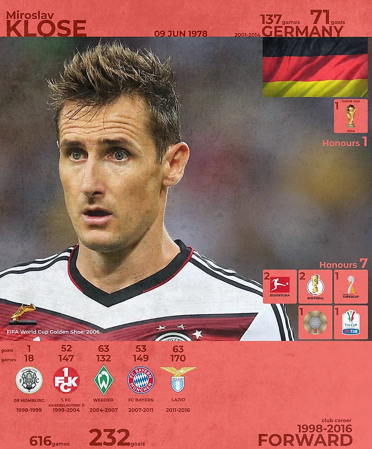 Рубрика - карьера футболиста в одной картинке. Собрал для вас всю информацию о Мирославе Клозе в одной информативной картинке. Приятного изучения.