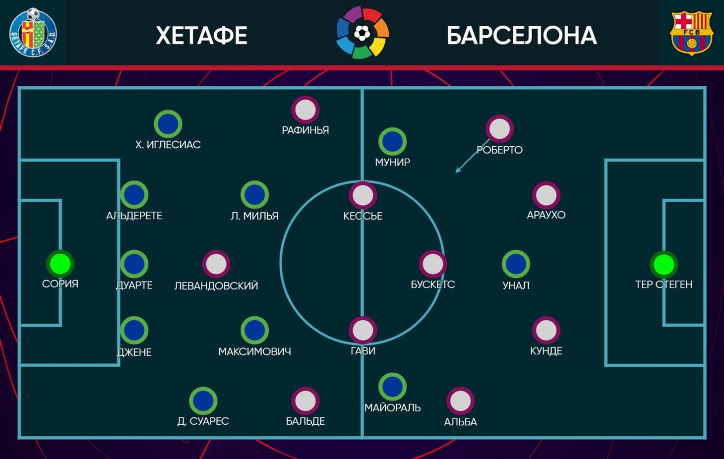 У «Хетафе» две кадровые потери – из-за травм матч с «Барселоной» пропускали Хайме Мата и Мауро Арамбарри. Стартовый состав от Кике Флореса обошёлся без сюрпризов – схема 5-4-1, где Майораль и Мунир располагались на флангах полузащиты.