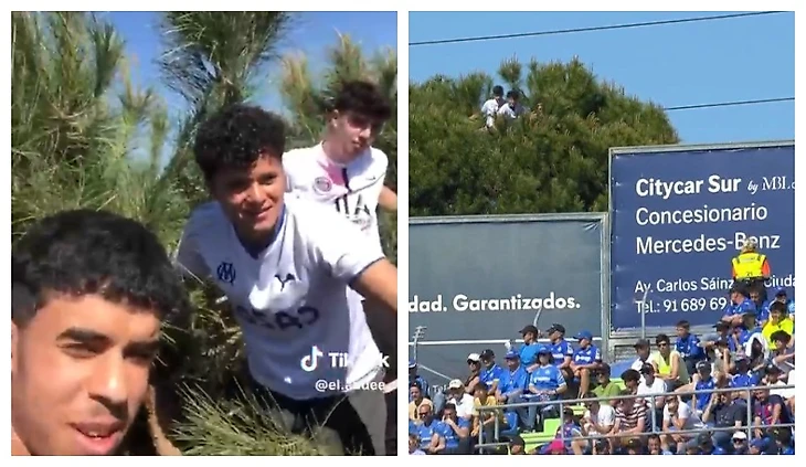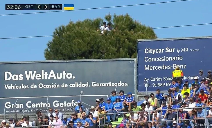 Трое болельщиков так хотели понаблюдать за матчем «Хетафе» и «Барселоны», что нашли оригинальный способ получить «картинку» - залезть на дерево, возвышающееся над трибунами. Правда, сделать это незаметно не удалось.