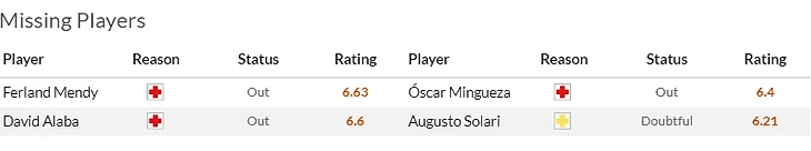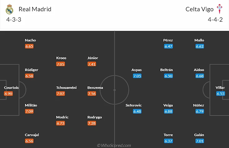 К счастью для мадридцев кадровые потери их пока не слишком потрепали и самая неприятная новость - это возможная дисквалификация Феде Вальверде(7,5) на срок от 4 до 12 игр за потасовку с Баэной после матча с Вильярреало. А вот Сельта точно не сможет рассчитывать в ближайшем туре на дисквалифицированного капитана Уго Мальо(5,5) и травмированных Айду(5,5) с Карлесом Пересом(6).