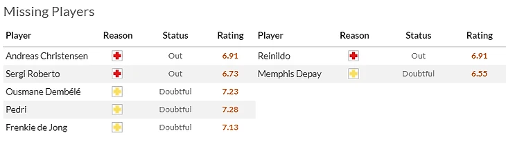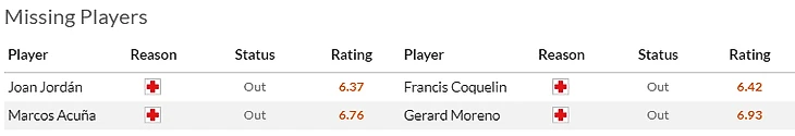 Также из приятных новостей - возвращение к тренировкам Дембеле(8), Де Йонга(7) и Педри(6,5). Все трое уже частично тренируются в общей группе и по идее уже скоро наберут необходимый тонус. Чо касается гостей, то здесь главные потери - синхронные дисквалификация Кондогбия(6) с Льоренте(7,5), а главная интрига- успеют ли мадридские доктора отшаманить Депая(9) к матчу с родной командой?