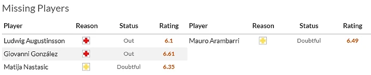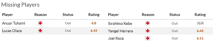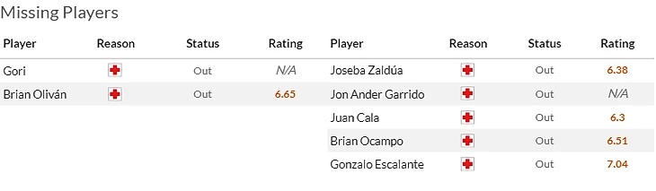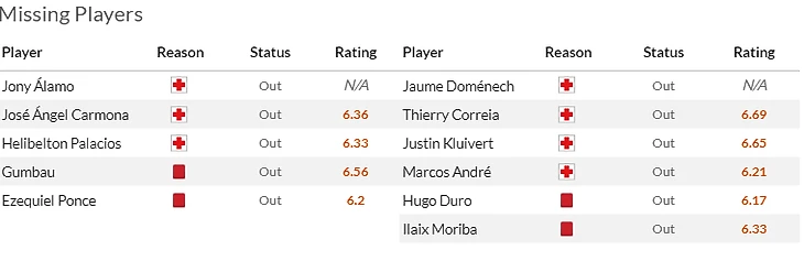 Что касается самих хозяев, то по прежнему кукуют в лазарете Паласиос(5) с Кармоной(5), а Гумбау(5,5) с Понсе(6,5) не сыграют в воскресенье из-за дисквалификации. Ну а у гостей целая россыпь проблем: главная беда - травма Джастина Клюйверта(7) на которую накручиваются дисквалификации Морибы(6) с Дуро(7), травма Коррейи(5,5) и туманное состояние здоровья Саму Кастильехо(7).