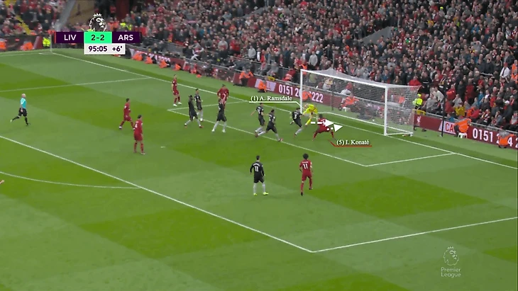 Поэтому Конате пришлось вернуть мяч своему вратарю, потому что в центре Александер-Арнолда ждали четыре игрока «Арсенала», готовые прессинговать.