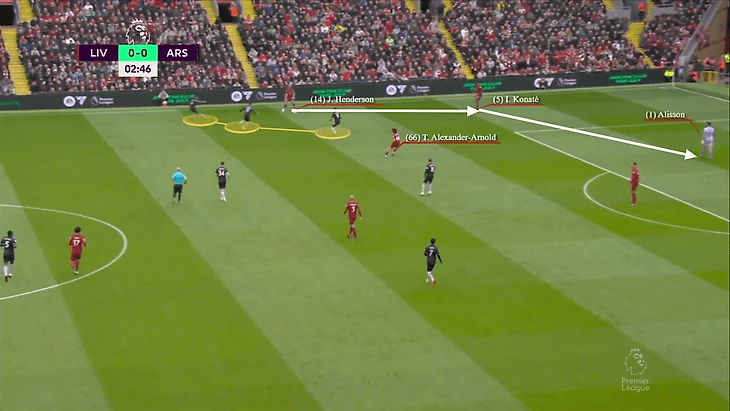 В этом эпизоде Алиссон отдал мяч на Ибраима Конате на правом фланге «Ливерпуля», но, поскольку команда все еще занимала свои позиции, Джордан Хендерсон не смог достаточно быстро убежать и занять фланговый коридор перед французом.