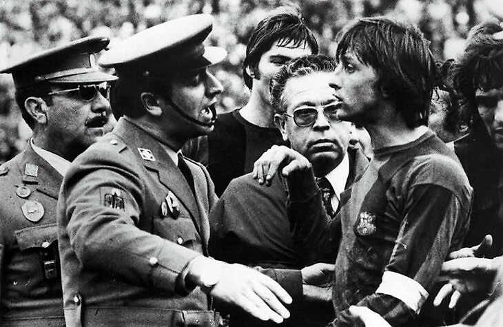 Пожалуй, самый известный момент заочного противостояния связан с матчем «Барселона» – «Малага» в феврале 1975-го. Тогда Кройффу не понравилась работа судьи – в ответ на обвинения арбитр показал ему красную карточку. Йохана уводили с поля полицейские, и фотография бунтаря, окруженного силовиками, стала хрестоматийной иллюстрацией несогласия с режимом.