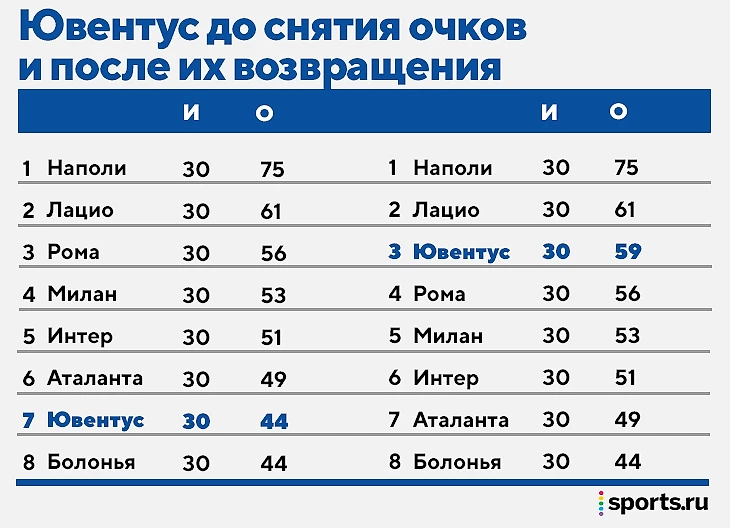 «Ювентусу» вернули 15 очков чемпионате Италии, которые в январе сняли из-за дела о фиктивном приросте капитала. Еще днем туринский клуб шел на восьмом месте в девяти очках зоны ЛЧ. Но к вечеру команда Макса Аллегри вернулась в топ-3.