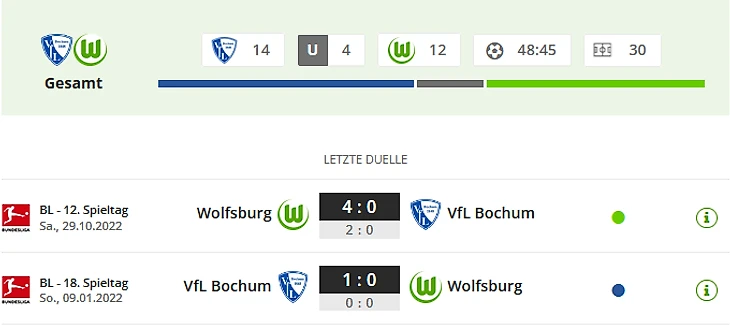 - Осенью «Вольфсбург» после победы против «Бохума» выиграл все оставшиеся матчи первого круга. - Если «Вольфсбург» повторит эту серию, то у «волков» все еще есть шанс на седьмое место и путевку в еврокубки. - Опыт против молодости: «Бохум» - самая старая команда лиги в этом сезоне – средний возраст игроков команды чуть более 29 лет. У «Вольфсбурга» средний возраст игроков 24,9 года – только у «Штутгарта» команда в среднем моложе (24,6 года).