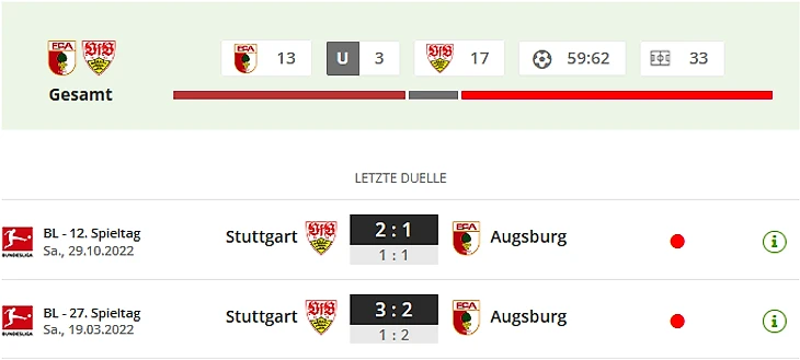 - Аугсбург не выигрывает уже в пяти матчах Бундеслиги подряд и проиграл две последние игры. - Аугсбург уже пять раз проигрывал в этом сезоне, несмотря на то, что вел в счете – больше, чем любая другая команда. - В осеннем матче «Штутгарт» выиграл у «Аугсбурга» со счетом 2:1. Вальдемар Антон забил победный гол в дополнительное время. «Штутгарт» нанес в том матче 31 удар по воротам гостей. Ни в одной другой игре «Аугсбург» не допускал такого количества ударов по своим воротам. - Энрико Маассен: «Штутгарт» в последнее время добился положительных результатов. Это всегда важно. Особенно, когда приходит новый тренер. Это хорошая команда, это было видно на протяжении всего сезона. В Лейпциге мы показали действительно хорошую игру. Конечно, сейчас для нас важно, чтобы мы снова набрали очки, лучше три». - Себастьян Хенесс: «У «Аугсбурга» есть четкая идея. Они пытаются сразу оказать давление на игрока с мячом. Они агрессивны, неудобны — особенно дома. Я с нетерпением жду матча. В пятницу вечером будет жаркий танец».