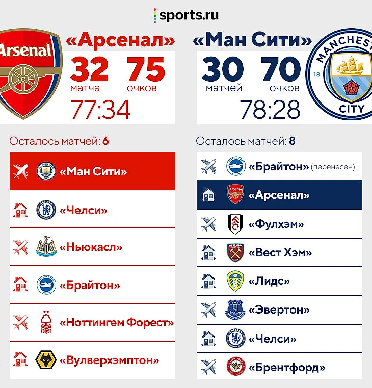 «Арсенал» впереди на пять очков, у «Сити» – два матча в запасе. То есть пока отрыв, но по потерянным очкам команда Пепа Гвардиолы уже впереди.