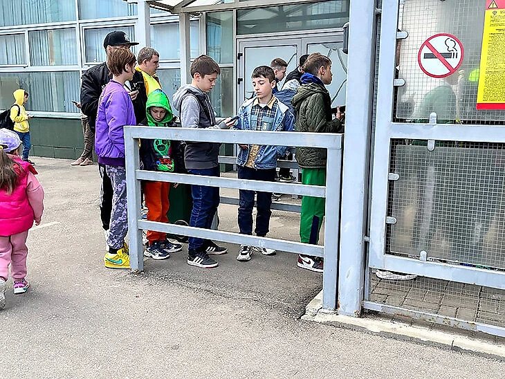 При мне возле выхода высаживается автобус детей с надписью «СШОР Бронницы» на спине. Да и вообще очереди на «Химки» выглядят так:
