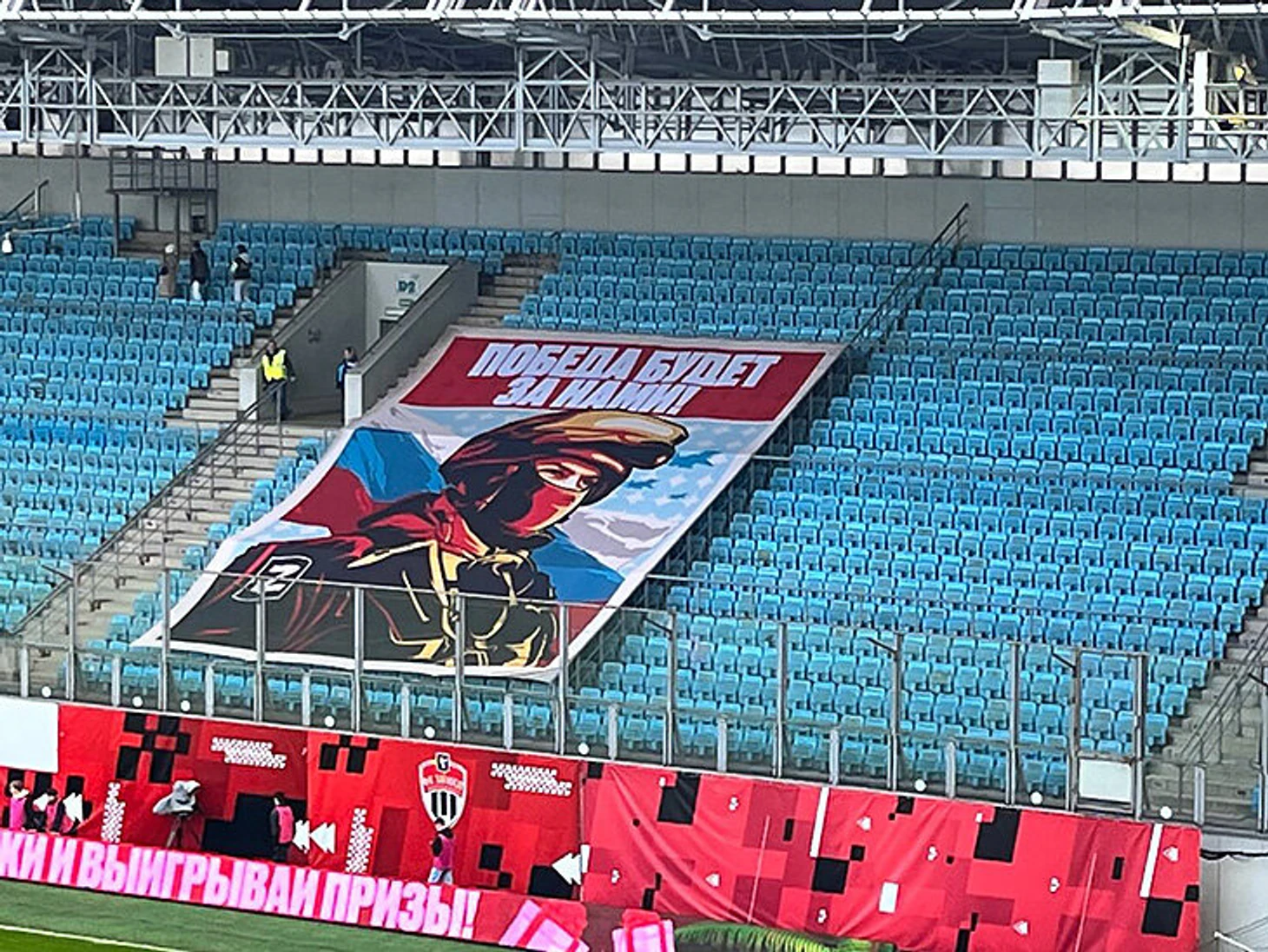 На фанатском секторе «Химок» висит баннер, на нем – солдат с буквой Z на плече, российский флаг и надпись «Победа будет за нами».