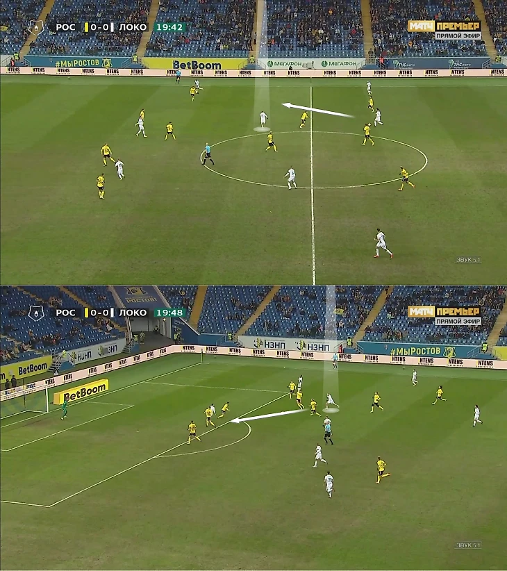 Здесь Глушенков подобрал мяч на выносе и убежал от Уткина: стянул на себя «Ростов» и дождался возвращения Пиняева в широкую позицию.