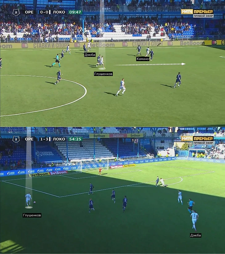 В голевой атаке Глушенков снова принял мяч между линиями: развернулся и своевременно катнул налево, хотя Дзюба уже ставил спину Виктору Мелехину. Во втором тайме «Локомотив» гораздо чаще атаковал длинными передачами, поэтому Глушенков еще активнее играл с Дзюбой. Обычно он забегал за спину или пользовался его умением сыграть в корпус, подстроился под обработку Артема (нырнул левее, а не бежал дальше в правую сторону). А против «Оренбурга» Максим переложил мяч под удобную ногу в открытую зону.