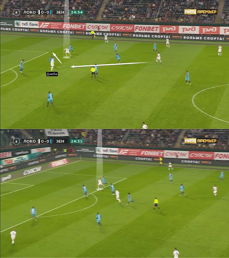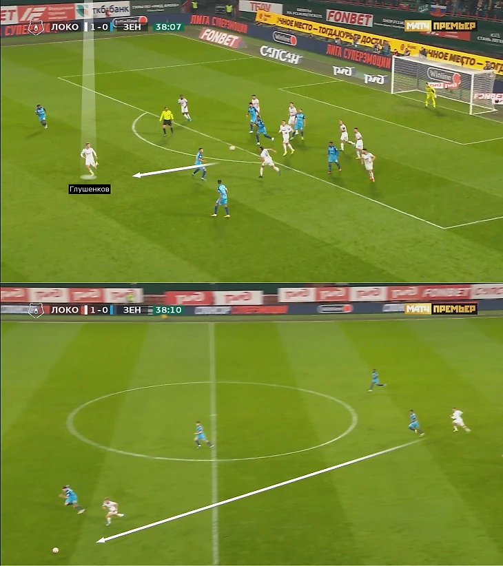 Другая идея ярко проявилась против «Зенита» и «Оренбурга» – рывки Глушенкова за спину Дзюбе. Но условия были разными. Против чемпиона Глушенков воспользовался ошибкой Ренана: отскочил от Сантоса и вбежал в оголенную зону.