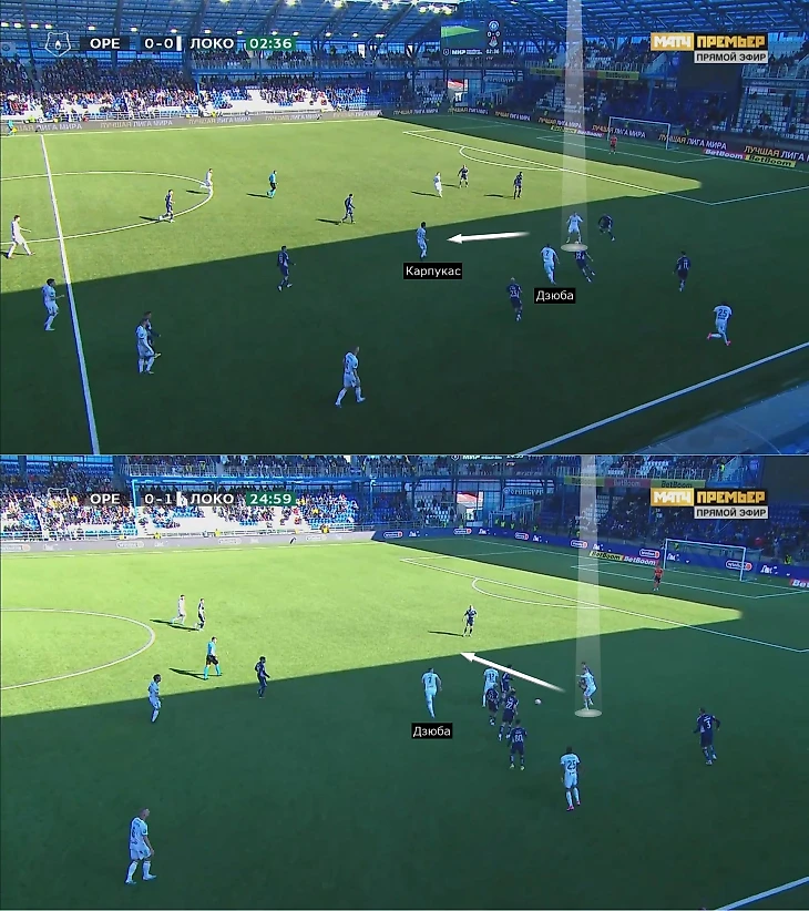 Например, здесь два одинаковых эпизода: Глушенков отбросил Карпукасу в середину после выноса Лантратова, а в голевой атаке, начавшейся с аута, в касание отдал Дзюбе на ход.