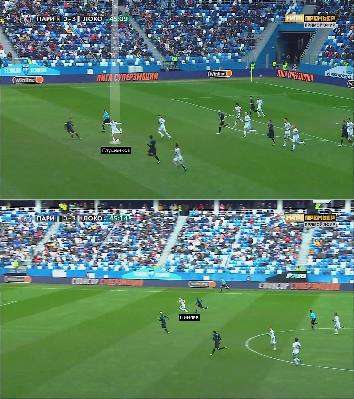 Как правило, при стандартах соперников Пиняев остается в середине поля. Его скорость и дриблинг гарантируют остроту на пространстве и могут дополнительно выманить одного игрока из штрафной ради подстраховки. Глушенков – важная часть этого контратакующего механизма. В некоторых матчах он оставался рядом со штрафной «Локо», а в игре с «Пари НН» караулил контратаки впереди вместе с Пиняевым.