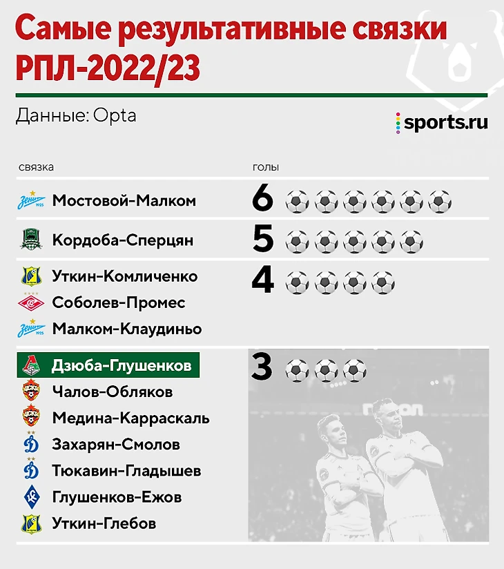 Весной Дзюба и Глушенков организовали уже три гола с передач друг друга (плюс прорыв Глушенкова с «Ростовом» и угловой против «Краснодара»). Это результативная связка весны и выделяются на фоне статистики всего сезона. Лидеры «Локо» крайне эффективны: например, Промес и Соболев сделали 27 передач под удар друг другу, Малком и Вендел – 26, а Глушенков и Дзюба – всего 5.