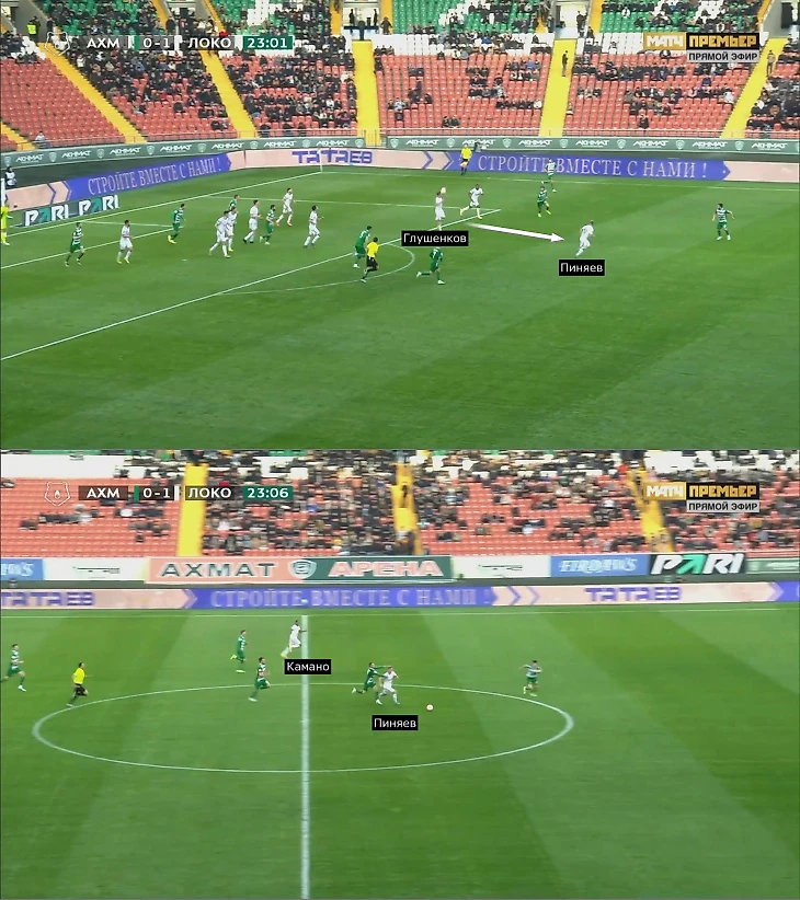 Против «Ахмата» Глушенков перехватил мяч на линии штрафной и в касание отдал Пиняеву: Сергей легко обыграл Ризвана Уциева и выбегал вместе с Камано, но не исполнил перевод налево.