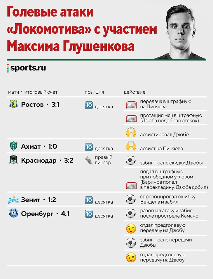 Влияние Глушенкова гораздо шире оформленных 4+2: быстрые решения приводят к голевым атакам, а непредсказуемость зажимает соперников в штрафной. Максим поучаствовал в 11 голах «Локо» из 16: великолепно сыграл с «Ростовом» (3:1) и «Оренбургом» (4:1), отдал победный пас Пиняеву в Грозном (1:0) и перевернул матч с «Краснодаром» (3:2).