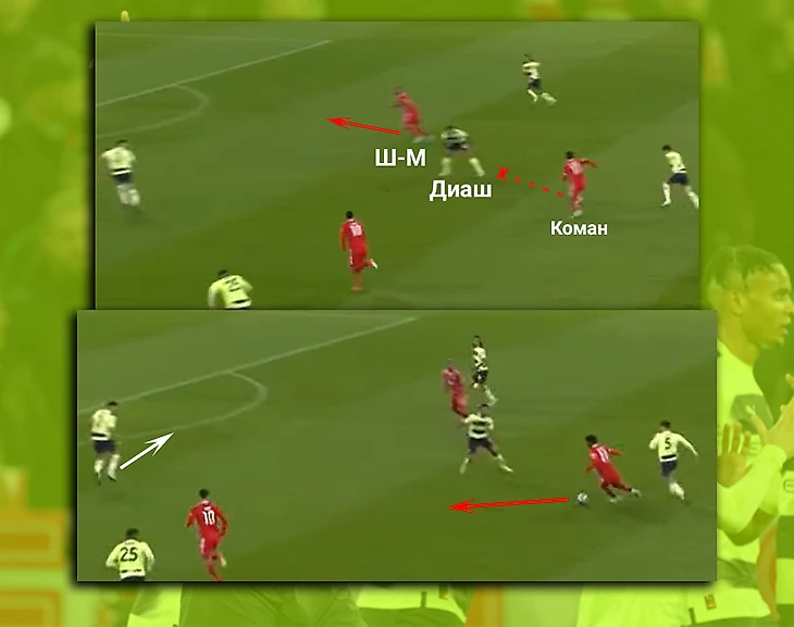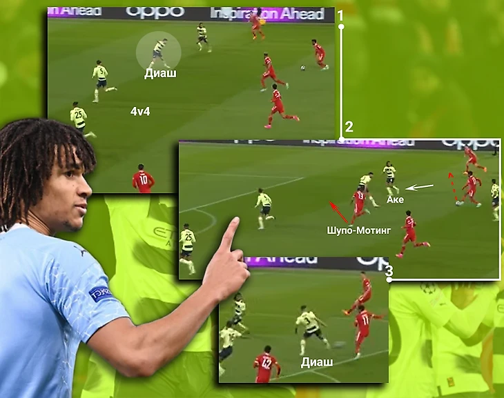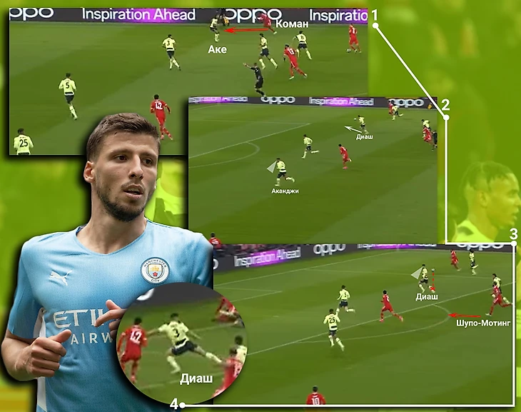 Оборона Сити В непривычной себе манере Манчестер Сити владел мячом меньше соперника и часто оказывался в ситуациях, где нужно отбирать мяч в первой трети поля. Бавария поставила гостей в такое положение благодаря качественным открываниям Комана. Кинглси мог опуститься к центру для продвижения мяча, а мог и резко рвануть за спину защитникам. От спринтов француза страдал Натан Аке. Защитник иногда занимал неправильное положение по отношению к сопернику. На картинке можно увидеть, как корпус голландца повернут к мячу (в положении полубоком куда быстрее можно развернуться и набрать скорость), в то время как Коман уже набирал скорость по бровке. Грамотное смещение и сканирование парнеров по обороне помогли в остановке быстрой атаки соперника: Диаш страховал Аке, одновременно перекрывая линию возможной передачи на второй темп под открывание Шупо-Мотинга, Аканжи отвечал за дальнюю штангу,а Стоунз за Мусиалу.