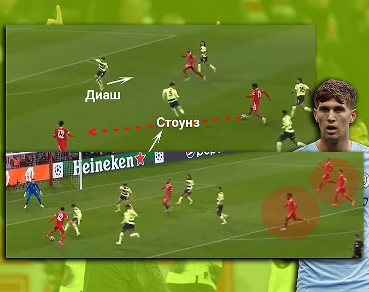 Вообще, направить атаку на фланг - один из важнейших принципов обороны. За его реализацию отвечали крайние защитники Стоунз и Аканжи. Их задачей было во время «заужать» оборону, спровоцировав пас на фланг. Так, атака соперника сходила с самого короткого пути до ворот