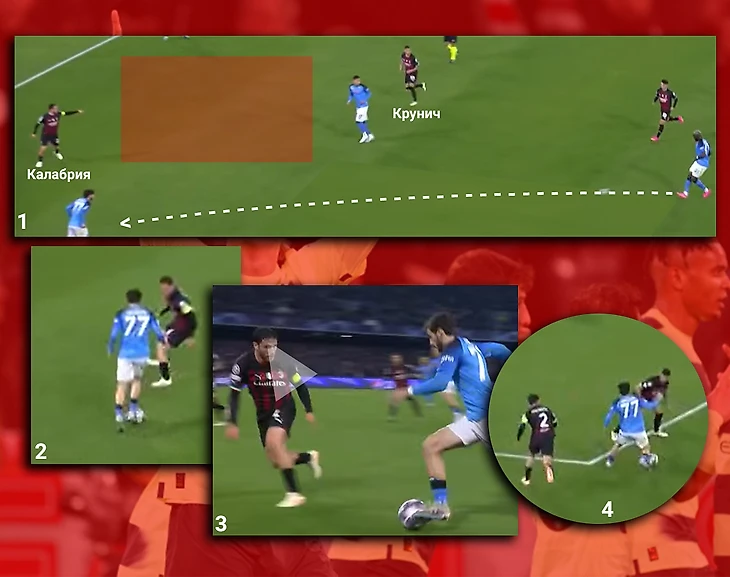 Давиде Калабрия выдерживал нужные расстояния до оппонента, а в отбор шел строго ближней ногой к сопернику. В случае отбора дальней ногой итальянец легко бы терял равновесие и с трудом менял бы направление движения. Ссылку на дополенение по работе Калабрии от Никиты Васюхина найдете у меня в телеграм-канале