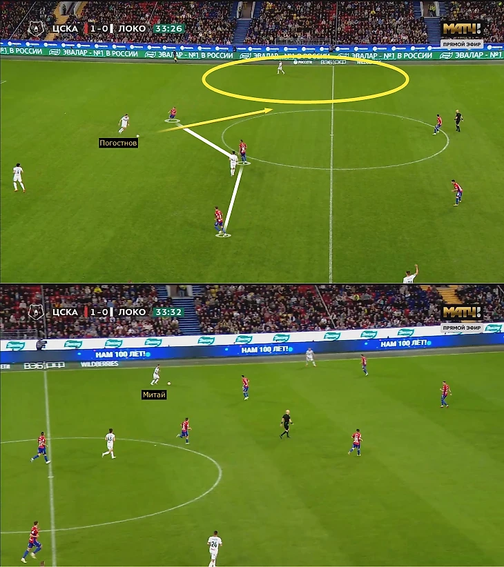 В итоге «Локо» застыл в полупозициях, а Обляков идеально распорядился катнул между Митаем (возвращался от Гайича) и Погостновым (страховал провал).