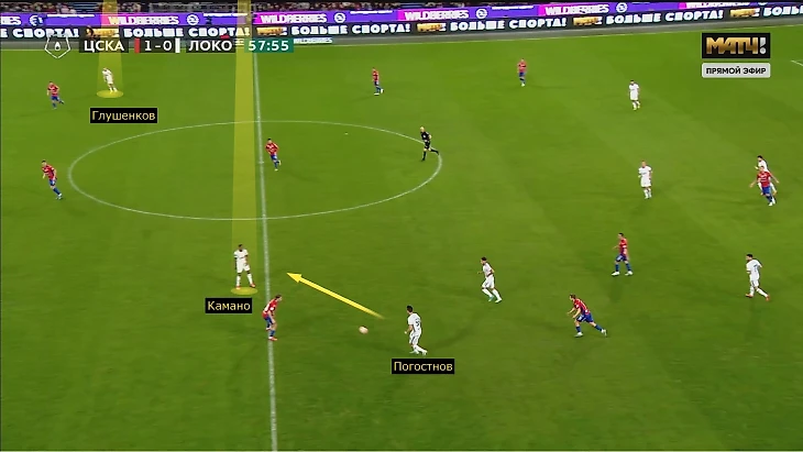 «Локомотив» терял контроль и эффективность из-за стартового плана Галактионова (об этом – в следующей главе), но сохранял шансы благодаря флангам. Например, Камано и Глушенков классно разыграли комбинацию слева еще до травмы Пиняева: Погостнов снова забросил на фланг, атака закончилась прострелом Глушенкова и перспективным вбеганием Баринова.