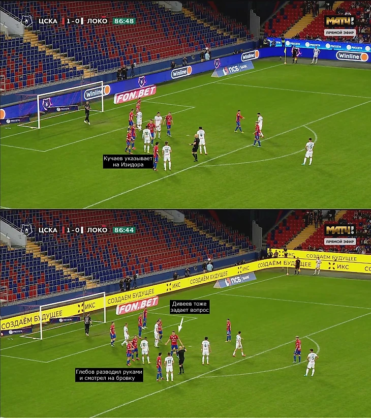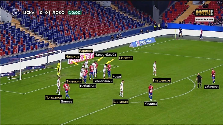 Интересно, что появление Изидора на угловом вызывало вопросы в ЦСКА. Изначально около француза стояли Глебов и Кучаев, активно обсуждавшие, как его закрывать, а затем к ним подключился Дивеев.