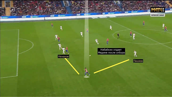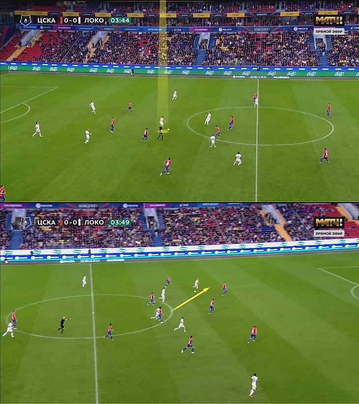 Во-первых, Пиняев/Тикнизян и Камано зачастую подсаживались пятыми или даже шестыми защитниками (попытка отреагировать на широкие включения латералей) – это позволяло ЦСКА искать мяч на флангах и полуфлангах. Во-вторых, Щетинин и Баринов не покрывали центр поля против подвижных Чалова, Мендеса, Медины и Облякова (их численно превосходили, либо опорники принимали неверные решения).