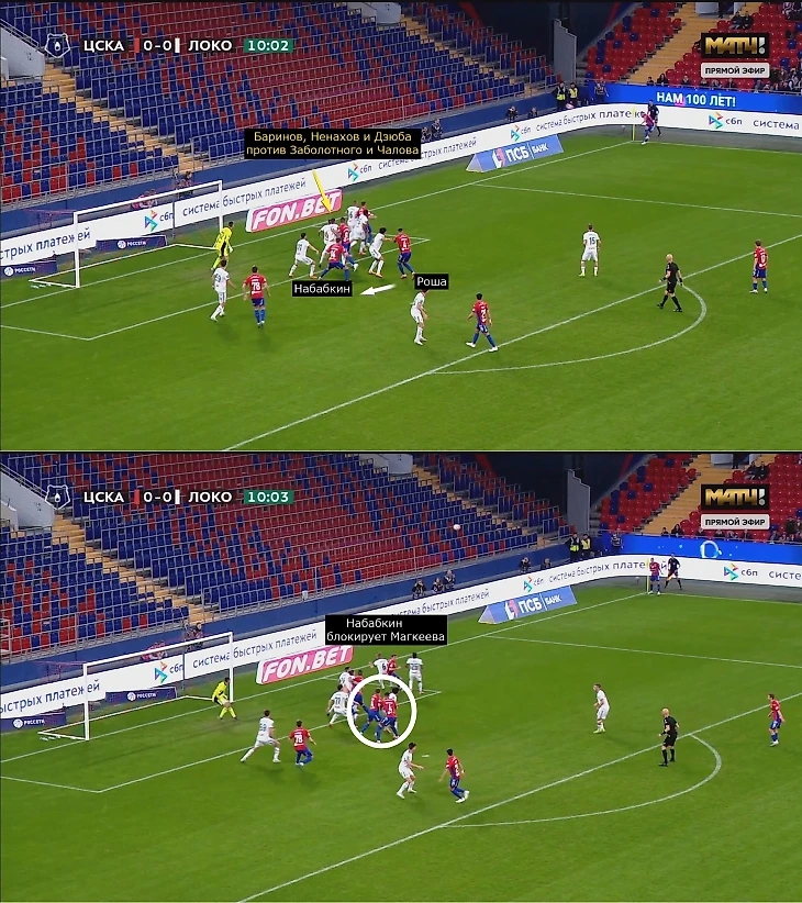 Периодически Глушенков и Дзюба прессинговали, но их давление не поддерживалось как раз из-за подвижной средней линии ЦСКА – Баринов и Щетинин выбирали между оголением зоны и сохранением позиции и компактности относительно защитников. Плюс вперед классно подключались Роша и Набабкин: Виллиан даже вбегал в штрафную, а Кирилл помогал в контроле слева. Как итог – «Локомотив» очень легко разрезали в разных фазах. Сначала отыгрывали Дзюбу и Глушенкова, а затем приходили в середину или полуфланг, где блуждали Обляков, Мендес и Чалов.